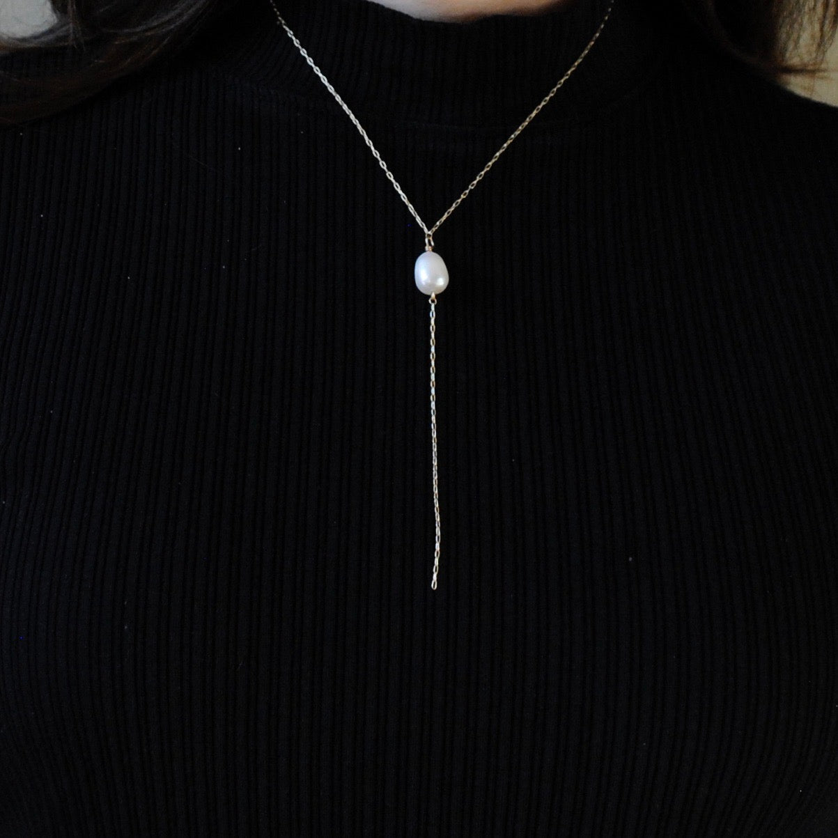 This necklace features a beautiful freshwater pearl suspended on a 16” chain made of 14k Gold Filled material.